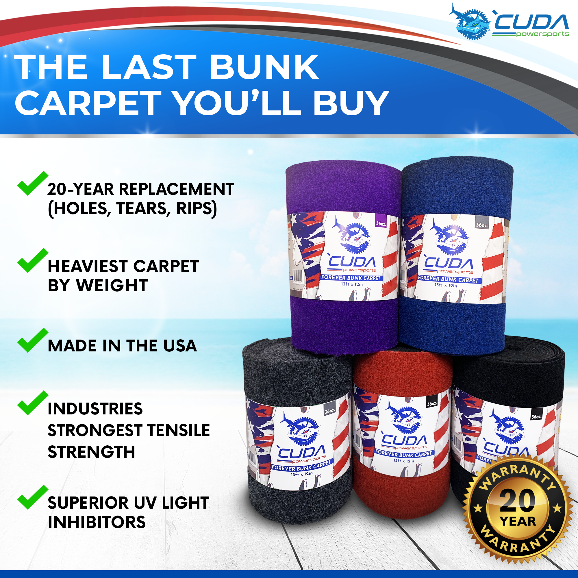 Only Available in Ultra Strong Marine Grade WOOD Bunk Boards with UPGRADED 36oz Forever Carpet